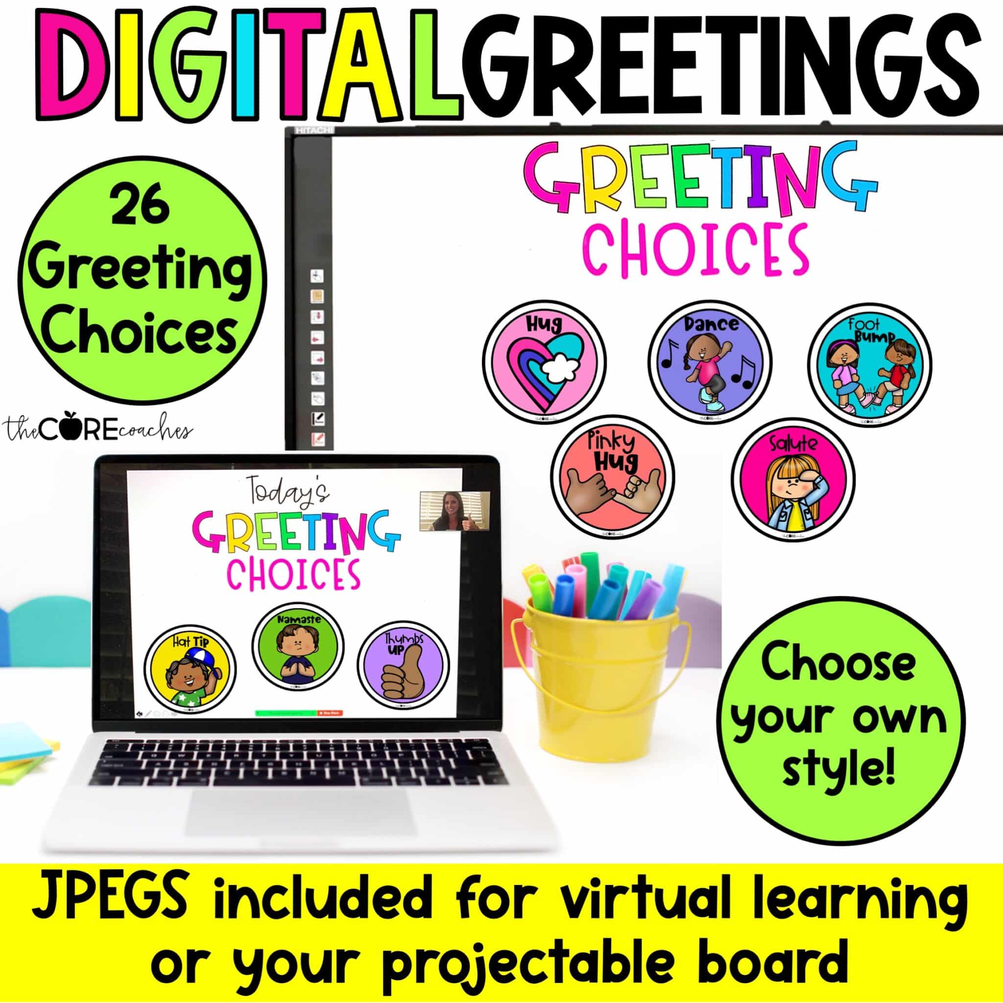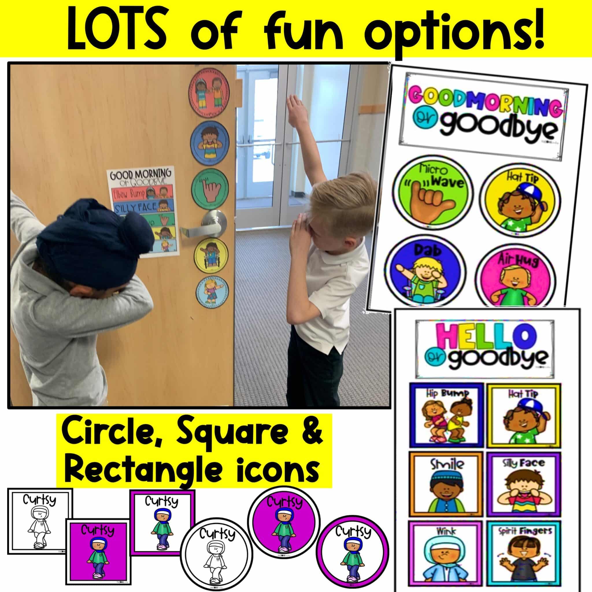 These morning greeting choices will immediately impact your classroom culture! Post these morning greeting signs on your classroom door as teacher or a student greeter warmly welcomes classmates as students choose their morning greeting when entering the room. You can also post them in any virtual classroom setting.